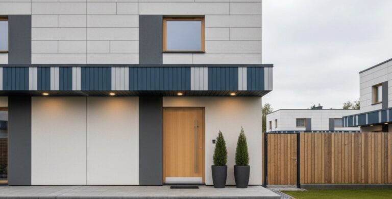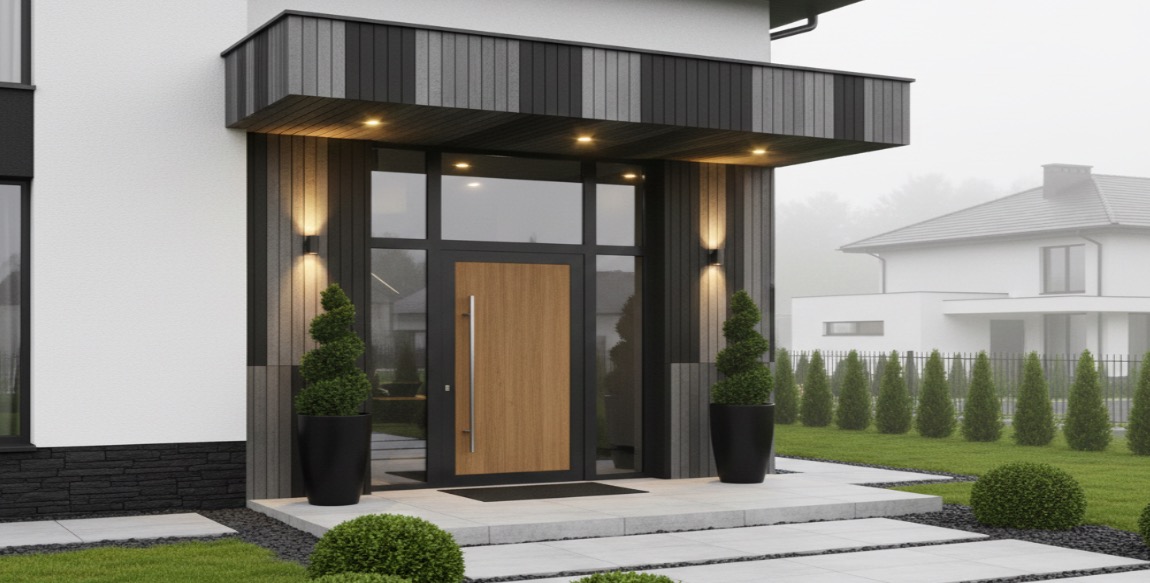 Iš fibrocementinių plokščių galime įrengti išraiškingų formų ir prabangaus dizaino namo įėjimo sienas su stogeliu.